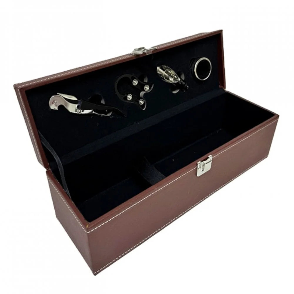 Cutie cadou pentru sticla de vin imbracata in piele ecologica,maro cu 4 accesorii