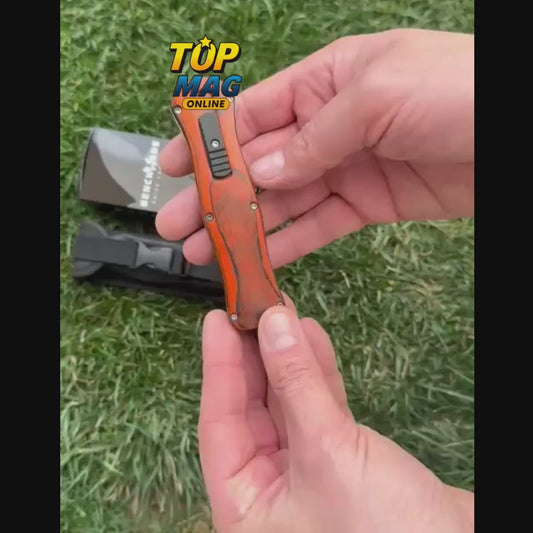 Briceag de Colectie automat Benchy maner: metal + placare lemn 22 cm cu husa si spargator geamuri