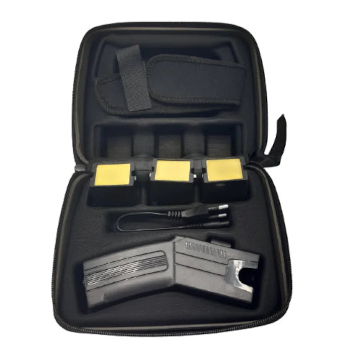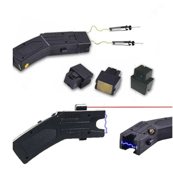 Efectul asupra agresorului este identic cu cel provocat de un aparat electrosoc de putere medie. Genereaza pana la 200 de descarcari a cate cinci secunde fiecare, numarul descarcarilor fiind controlat de dvs. prin timpul de apasare pe declansator. Are un dispozitiv de ochire cu laser care proiecteaza un punct rosu luminos pe corpul atacatorului. Nu are niciun fel de recul, folosirea sa este foarte sigura pentru utilizator, nu exista posibilitatea autoaplicarii socurilor in timpul folosirii. Cu acest dispozitiv puteti opri in siguranta o amenintare de la o distanta de pana la 5 metri, indiferent de zona corpului in care capetele cablurilor lovesc tinta. Modalitatea de tintire si tragere este aceeasi ca si in cazul armelor de foc.